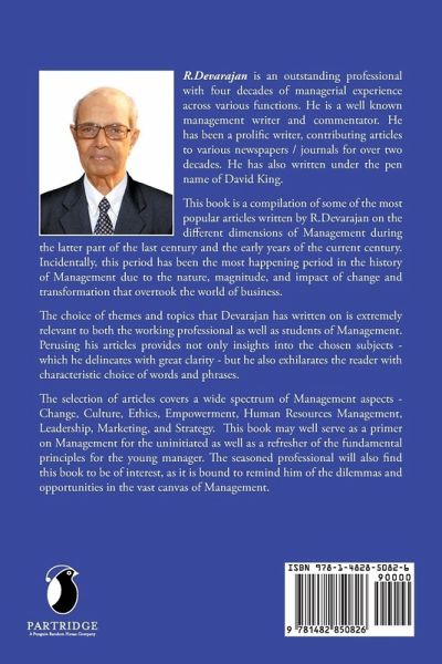 This book is a compilation of some of the most popular articles written by David King / R.Devarajan on the diferent dimensions of Management during the later part of the last century and the early years of the current century. This period incidentally has been the most happening period in the history of management due the nature, magnitude and impact of change and transformation that swept the world of business. The choice of themes and topics that Devarajan has written on is extremely relevant to both the working professional as well as students of management. Perusing his articles provides not only insights into the chosen subjects - which he delineates with great clarity - but he also exhilarates the reader with characteristic choice of words and phrases. The selection of articles covers a wide spectrum of management aspects - Change, Culture, Ethics, Empowerment, Human Resource Management, Leadership, Marketing and Strategy. This book may well serve as a primer to management for the uninitiated as well a refresher of the fundamental principles for the young manager. The seasoned professional will also find this book of interest for it is bound to remind him of the dilemnas and opportunities in the vast canvas of Management.