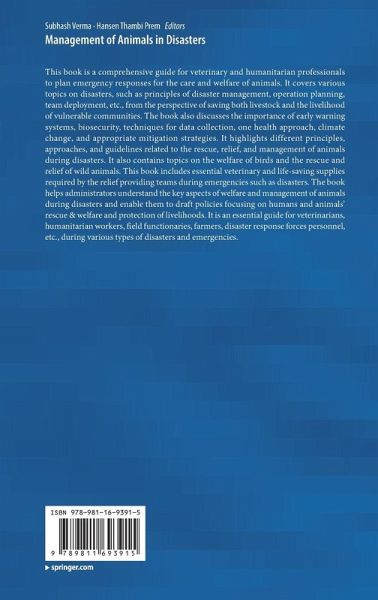 This book is a comprehensive guide for veterinary and humanitarian professionals to plan emergency responses for the care and welfare of animals. It covers various topics on disasters, such as principles of disaster management, operation planning, team deployment, etc., from the perspective of saving both livestock and the livelihood of vulnerable communities. The book also discusses the importance of early warning systems, biosecurity, techniques for data collection, one health approach, climate change, and appropriate mitigation strategies. It highlights different principles, approaches, and guidelines related to the rescue, relief, and management of animals during disasters. It also contains topics on the welfare of birds and the rescue and relief of wild animals. This book includes essential veterinary and life-saving supplies required by the relief providing teams during emergencies such as disasters. The book helps administrators understand the key aspects of welfare and management of animals during disasters and enable them to draft policies focusing on humans and animals' rescue & welfare and protection of livelihoods. It is an essential guide for veterinarians, humanitarian workers, field functionaries, farmers, disaster response forces personnel, etc., during various types of disasters and emergencies.