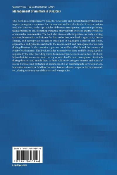This book is a comprehensive guide for veterinary and humanitarian professionals to plan emergency responses for the care and welfare of animals. It covers various topics on disasters, such as principles of disaster management, operation planning, team deployment, etc., from the perspective of saving both livestock and the livelihood of vulnerable communities. The book also discusses the importance of early warning systems, biosecurity, techniques for data collection, one health approach, climate change, and appropriate mitigation strategies. It highlights different principles, approaches, and guidelines related to the rescue, relief, and management of animals during disasters. It also contains topics on the welfare of birds and the rescue and relief of wild animals. This book includes essential veterinary and life-saving supplies required by the relief providing teams during emergencies such as disasters. The book helps administrators understand the key aspects of welfare and management of animals during disasters and enable them to draft policies focusing on humans and animals' rescue & welfare and protection of livelihoods. It is an essential guide for veterinarians, humanitarian workers, field functionaries, farmers, disaster response forces personnel, etc., during various types of disasters and emergencies.