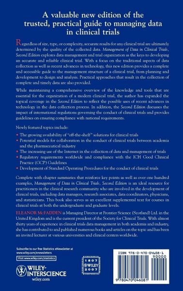Complete with chapter summaries that reinforce key points as well as over one hundred examples, Management of Data in Clinical Trials, Second Edition is an ideal resource for practitioners in the clinical research community who are involved in the development of clinical trials, including data managers, research associates, data coordinators, physicians, and statisticians. This book also serves as an excellent supplemental text for courses in clinical trials at both the undergraduate and graduate levels.