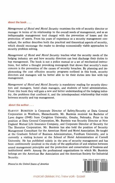 This book presents ideas to hotel/motel security directors and managers to help them understand some of the problems with which they will be confronted, the various approaches to solutions, and the ways of relating to other members of the management team to achieve optimum results.