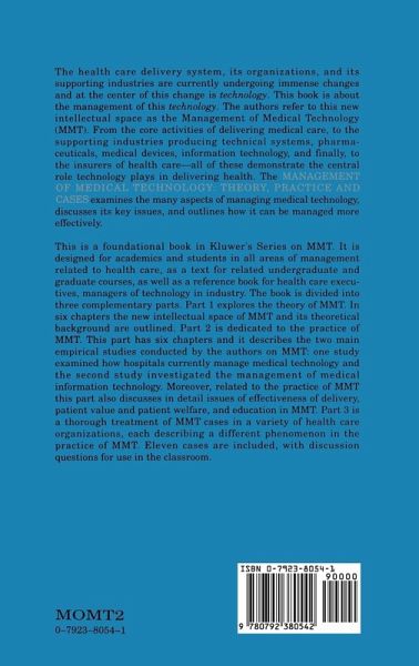 This is the second book in the series of books that we edit on the Management of Medical Technology (MMT) published by Kluwer Academic Publishers. The fIrst book Managing Technology in Health Care offered a broad-brushed view of the topics involved in the new and exciting area of MMT that we have launched. A group of distinguished scholars contributed to the fIrst book. While working on the first book in the series, and on a variety of articles in MMT, we began to realize that there is an urgent need for a comprehensive and highly focused book which will introduce and define the area of MMT. In addition, we had just completed the two studies of MMT in American hospitals, and had a magnificent database fully analyzed. With three months left in the first author's sabbatical, and thanks to the encouragement from our editor at Kluwer, Gary Folven, we took to the task of writing this book. The merging in this book of the description of a new intellectual space, and the write-up of theresults from our MMT studies have created a unique blend of very attractive reading material. The reader will find this book to be a fascinating adventure into a newly-created area of intellectual endeavor, coupled with fIndings about how the health care delivery system manages teclUlology. Regardless of the reader's background, this book will certainly be of interest, as it links the medical and business frameworks.
