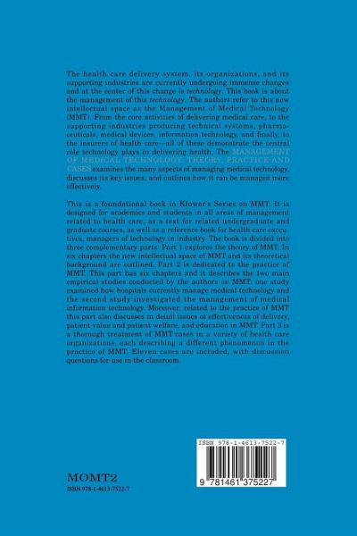 This is the second book in the series of books that we edit on the Management of Medical Technology (MMT) published by Kluwer Academic Publishers. The fIrst book Managing Technology in Health Care offered a broad-brushed view of the topics involved in the new and exciting area of MMT that we have launched. A group of distinguished scholars contributed to the fIrst book. While working on the first book in the series, and on a variety of articles in MMT, we began to realize that there is an urgent need for a comprehensive and highly focused book which will introduce and define the area of MMT. In addition, we had just completed the two studies of MMT in American hospitals, and had a magnificent database fully analyzed. With three months left in the first author's sabbatical, and thanks to the encouragement from our editor at Kluwer, Gary Folven, we took to the task of writing this book. The merging in this book of the description of a new intellectual space, and the write-up of theresults from our MMT studies have created a unique blend of very attractive reading material. The reader will find this book to be a fascinating adventure into a newly-created area of intellectual endeavor, coupled with fIndings about how the health care delivery system manages teclUlology. Regardless of the reader's background, this book will certainly be of interest, as it links the medical and business frameworks.