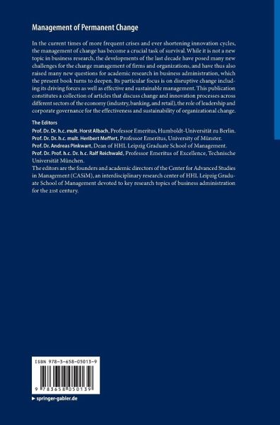 In the current times of more frequent crises and ever shortening innovation cycles, the management of change has become a crucial task of survival. While it is not a new topic in business research, the developments of the last decade have posed many new challenges for the change management of firms and organizations and have thus also raised many new questions for academic research in business administration, which the present book turns to deepen.Its particular focus is on disruptive change including its driving forces as well as effective and sustainable management. This publication constitutes a collection of articles that discuss change and innovation processes across different sectors of the economy (industry, banking, and retail), the role of leadership and corporate governance for the effectiveness and sustainability of organizational change.