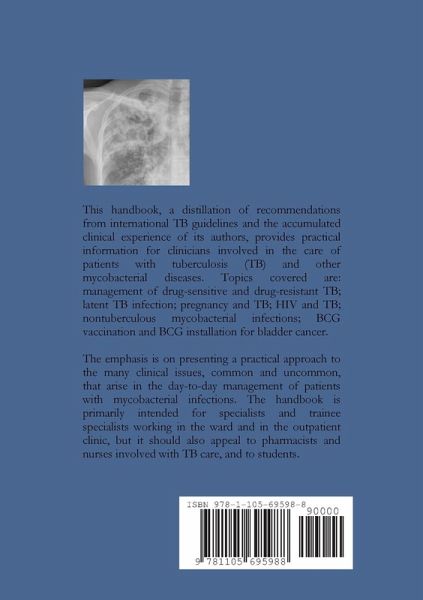 This handbook, a distillation of recommendations from international TB guidelines and the accumulated clinical experience of its authors, provides practical information for clinicians involved in the care of patients with tuberculosis (TB) and other mycobacterial diseases. Topics covered are: management of drug-sensitive and drug-resistant TB; latent TB infection; pregnancy and TB; HIV and TB; nontuberculous mycobacterial infections; BCG vaccination and BCG installation for bladder cancer. The emphasis is on presenting a practical approach to the many clinical issues, common and uncommon, that arise in the day-to-day management of patients with mycobacterial infections. The handbook is primarily intended for specialists and trainee specialists working in the ward and in the outpatient clinic, but it should also appeal to pharmacists and nurses involved in TB care, and to students.