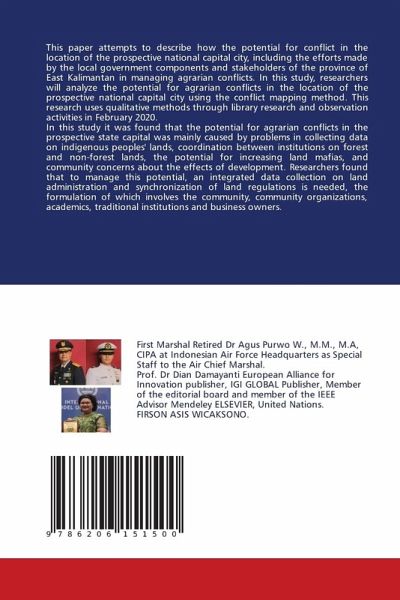 This paper attempts to describe how the potential for conflict in the location of the prospective national capital city, including the efforts made by the local government components and stakeholders of the province of East Kalimantan in managing agrarian conflicts. In this study, researchers will analyze the potential for agrarian conflicts in the location of the prospective national capital city using the conflict mapping method. This research uses qualitative methods through library research and observation activities in February 2020.In this study it was found that the potential for agrarian conflicts in the prospective state capital was mainly caused by problems in collecting data on indigenous peoples' lands, coordination between institutions on forest and non-forest lands, the potential for increasing land mafias, and community concerns about the effects of development. Researchers found that to manage this potential, an integrated data collection on land administration and synchronization of land regulations is needed, the formulation of which involves the community, community organizations, academics, traditional institutions and business owners.