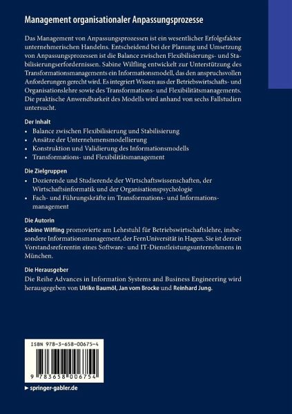 Das Management von Anpassungsprozessen ist ein wesentlicher Erfolgsfaktor unternehmerischen Handelns. Entscheidend bei der Planung und Umsetzung von Anpassungsprozessen ist die Balance zwischen Flexibilisierungs- und Stabilisierungserfordernissen. Sabine Wilfling entwickelt zur Unterstützung des Transformationsmanagements ein Informationsmodell, das am Design-Science-Prozess der Wirtschaftsinformatik orientiert ist. Es integriert Wissen aus der Betriebswirtschafts- und Organisationslehre sowie des Transformations- und Flexibilitätsmanagements. Die praktische Anwendbarkeit des Modells wird anhand von sechs Fallstudien untersucht.