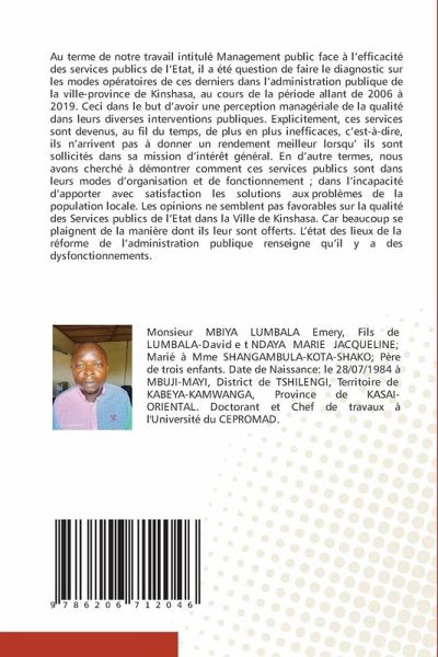 Au terme de notre travail intitulé Management public face à l'efficacité des services publics de l'Etat, il a été question de faire le diagnostic sur les modes opératoires de ces derniers dans l'administration publique de la ville-province de Kinshasa, au cours de la période allant de 2006 à 2019. Ceci dans le but d'avoir une perception managériale de la qualité dans leurs diverses interventions publiques. Explicitement, ces services sont devenus, au fil du temps, de plus en plus inefficaces, c'est-à-dire, ils n'arrivent pas à donner un rendement meilleur lorsqu' ils sont sollicités dans sa mission d'intérêt général. En d'autre termes, nous avons cherché à démontrer comment ces services publics sont dans leurs modes d'organisation et de fonctionnement ; dans l'incapacité d'apporter avec satisfaction les solutions aux problèmes de la population locale. Les opinions ne semblent pas favorables sur la qualité des Services publics de l'Etat dans la Ville de Kinshasa. Car beaucoup se plaignent de la manière dont ils leur sont offerts. L'état des lieux de la réforme de l'administration publique renseigne qu'il y a des dysfonctionnements.