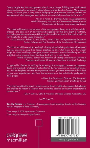 "Many people fear that management schools are no longer fulfilling their fundamental mission; educating this generation's global citizens and leaders. Eric Kessler's Management Theory in Action goes a long way in bridging the gap between what universities are teaching and what managers need to know to successfully contribute to the world." - Nancy J. Adler, S. Bronfman Chair in Management at McGill University and Author of International Dimensions of Organizational Behavior and Leadership Insight