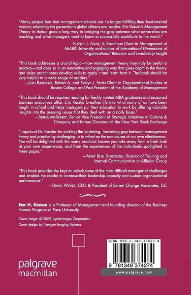 "Many people fear that management schools are no longer fulfilling their fundamental mission; educating this generation's global citizens and leaders. Eric Kessler's Management Theory in Action goes a long way in bridging the gap between what universities are teaching and what managers need to know to successfully contribute to the world." - Nancy J. Adler, S. Bronfman Chair in Management at McGill University and Author of International Dimensions of Organizational Behavior and Leadership Insight
