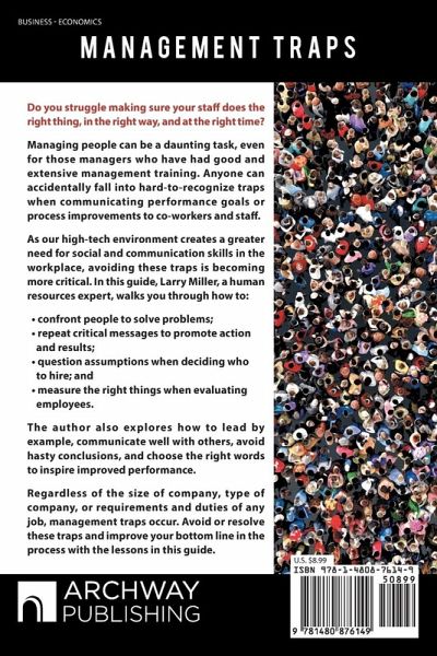 Do you struggle making sure your staff does the right thing, in the right way, and at the right time? Managing people can be a daunting task, even for those managers who have had good and extensive management training. Anyone can accidentally fall into hard-to-recognize traps when communicating performance goals or process improvements to co-workers and staff. As our high-tech environment creates a greater need for social and communication skills in the workplace, avoiding these traps is becoming more critical. In this guide, Larry Miller, a human resources expert, walks you through how to: ¿ confront people to solve problems; ¿ repeat critical messages to promote action and results; ¿ question assumptions when deciding who to hire; and ¿ measure the right things when evaluating employees. The author also explores how to lead by example, communicate well with others, avoid hasty conclusions, and choose the right words to inspire improved performance. Regardless of the size of company, type of company, or requirements and duties of any job, management traps occur. Avoid or resolve these traps and improve your bottom line in the process with the lessons in this guide.