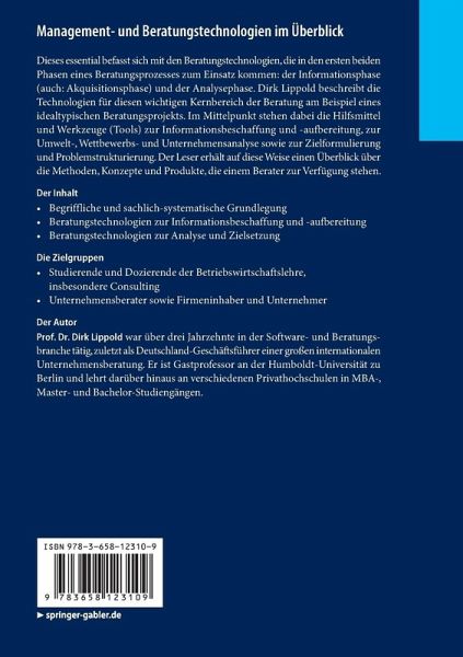 Dieses essential befasst sich mit den Beratungstechnologien, die in den ersten beiden Phasen eines Beratungsprozesses zum Einsatz kommen: der Informationsphase (auch: Akquisitionsphase) und der Analysephase. Dirk Lippold beschreibt die Technologien für diesen wichtigen Kernbereich der Beratung am Beispiel eines idealtypischen Beratungsprojekts. Im Mittelpunkt stehen dabei die Hilfsmittel und Werkzeuge (Tools) zur Informationsbeschaffung und -aufbereitung, zur Umwelt-, Wettbewerbs- und Unternehmensanalyse sowie zur Zielformulierung und Problemstrukturierung. Der Leser erhält auf diese Weise einen Überblick über die Methoden, Konzepte und Produkte, die einem Berater zur Verfügung stehen.