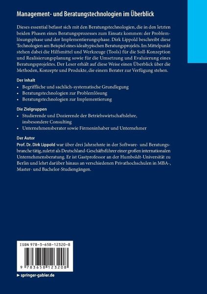 Dieses essential befasst sich mit den Beratungstechnologien, die in den letzten beiden Phasen eines Beratungsprozesses zum Einsatz kommen: der Problemlösungsphase und der Implementierungsphase. Dirk Lippold beschreibt diese Technologien am Beispiel eines idealtypischen Beratungsprojekts. Im Mittelpunkt stehen dabei die Hilfsmittel und Werkzeuge (Tools) für die Soll-Konzeption und Realisierungsplanung sowie für die Umsetzung und Evaluierung eines Beratungsprojektes. Der Leser erhält auf diese Weise einen Überblick über die Methoden, Konzepte und Produkte, die einem Berater zur Verfügung stehen.