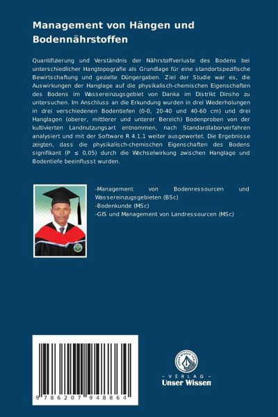 Quantifizierung und Verständnis der Nährstoffverluste des Bodens bei unterschiedlicher Hangtopografie als Grundlage für eine standortspezifische Bewirtschaftung und gezielte Düngergaben. Ziel der Studie war es, die Auswirkungen der Hanglage auf die physikalisch-chemischen Eigenschaften des Bodens im Wassereinzugsgebiet von Danka im Distrikt Dinsho zu untersuchen. Im Anschluss an die Erkundung wurden in drei Wiederholungen in drei verschiedenen Bodentiefen (0-0, 20-40 und 40-60 cm) und drei Hanglagen (oberer, mittlerer und unterer Bereich) Bodenproben von der kultivierten Landnutzungsart entnommen, nach Standardlaborverfahren analysiert und mit der Software R 4.1.1 weiter ausgewertet. Die Ergebnisse zeigten, dass die physikalisch-chemischen Eigenschaften des Bodens signifikant (P 0,05) durch die Wechselwirkung zwischen Hanglage und Bodentiefe beeinflusst wurden.