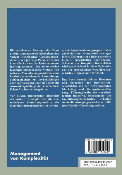 Christoph Bliss überführt die einzelnen Ansätze des Komplexitätsmanagement in eine integrierte Implementierungsabfolge der strukturellen Komplexitätsreduktion. Das daraus abgeleitete Phasenmodell berücksichtigt integrativ die gesamte Interdependenz der spezifischen Vereinfachungsansätze.