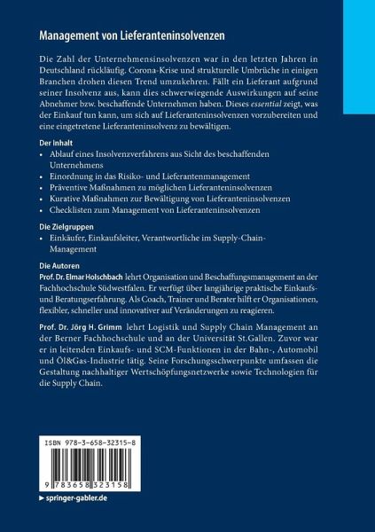 Die Zahl der Unternehmensinsolvenzen war in den letzten Jahren in Deutschland rückläufig. Corona-Krise und strukturelle Umbrüche in einigen Branchen drohen diesen Trend umzukehren. Fällt ein Lieferant aufgrund seiner Insolvenz aus, kann dies schwerwiegende Auswirkungen auf seine Abnehmer bzw. beschaffende Unternehmen haben. Dieses essential zeigt, was der Einkauf tun kann, um sich auf Lieferanteninsolvenzen vorzubereiten und eine eingetretene Lieferanteninsolvenz zu bewältigen.