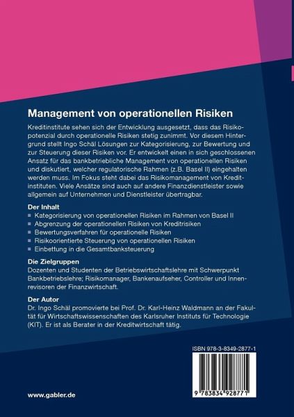 Kreditinstitute sehen sich der Entwicklung ausgesetzt, dass das Risikopotenzial durch operationelle Risiken stetig zunimmt. Vor diesem Hintergrund stellt Ingo Schäl Lösungen zur Kategorisierung, zur Bewertung und zur Steuerung dieser Risiken vor. Er entwickelt einen in sich geschlossenen Ansatz für das bankbetriebliche Management von operationellen Risiken und diskutiert, welcher regulatorische Rahmen (z.B. Basel II) eingehalten werden muss. Im Fokus steht dabei das Risikomanagement von Kreditinstituten. Viele Ansätze sind auch auf andere Finanzdienstleister sowie allgemein auf Unternehmen und Dienstleister übertragbar.