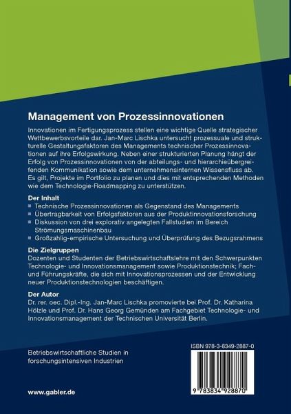 Innovationen im Fertigungsprozess stellen eine wichtige Quelle strategischer Wettbewerbsvorteile dar. Jan-Marc Lischka untersucht prozessuale und strukturelle Gestaltungsfaktoren des Managements technischer Prozessinnovationen auf ihre Erfolgswirkung. Neben einer strukturierten Planung hängt der Erfolg von Prozessinnovationen von der abteilungs- und hierarchieübergreifenden Kommunikation sowie dem unternehmensinternen Wissensfluss ab. Es gilt, Projekte im Portfolio zu planen und dies mit entsprechenden Methoden wie dem Technologie-Roadmapping zu unterstützen.