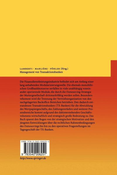Großbankkonzerne zerfallen in viele unabhängig voneinander operierende Module, die durch Outsourcing drittmarktfähig werden sollen. Besonders vehement wird die Trennung der Vertriebsorganisation von den nachgelagerten Backoffice-Bereichen betrieben. Den dadurch entstandenen Transaktionsbanken (TX-Banken) für die Abwicklung des Wertpapiergeschäfts, des Zahlungsverkehrs u.a. kommt aufgrund des dahinterstehenden Geschäftsvolumens wirtschaftlich und strategisch große Bedeutung zu. Das Buch spannt den Bogen von der strategischen Motivation und den jüngsten Entwicklungen über die rechtlichen Rahmenbedingungen des Outsourcings bis hin zu den operativen Fragestellungen im Tagesgeschäft der TX-Banken.