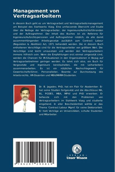 In diesem Buch geht es um Vertragsarbeit und Vertragsarbeitsmanagement am Beispiel des Stahlwerks Vizag. Eine umfassende Übersicht und Studie über die Notlage der Vertragsarbeiter, der Ingenieure/Aufsichtsführenden und der Auftragnehmer. Der Inhalt des Buches ist als Referenz für Ingenieure/Aufsichtspersonen und Auftragnehmer nützlich, da alle damit zusammenhängenden Arbeitsgesetze zusätzlich zum Contract Labour (Regulation & Abolition) Act, 1971 behandelt werden. Die in diesem Buch enthaltenen Vorschläge sind für die Vertragsarbeiter von größtem Wert. Die Vorschläge sind leicht umzusetzen und werden den Vertragsarbeitern immens hilfreich sein. Wenn die Empfehlungen erst einmal umgesetzt sind, werden die Chancen für IR-Situationen in den Organisationen in Bezug auf Vertragsarbeitnehmer geringer werden. Es lohnt sich also, ein Buch für Vorgesetzte und Ingenieure bereitzuhalten, die mit Leiharbeitern zusammenarbeiten. Es ist ein nützliches Nachschlagewerk für Gewerkschaftsführer, Personalleiter, Beamte zur Durchsetzung des Arbeitsrechts, HR-Dozenten und MBA/MHRM-Studenten.