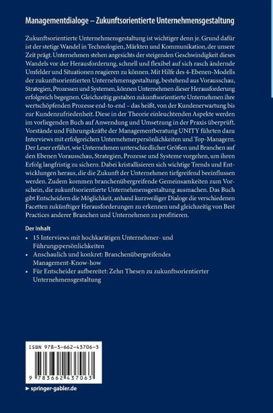 Zukunftsorientierte Unternehmensgestaltung ist wichtiger denn je. Grund dafür ist der stetige Wandel in Technologien, Märkten und Kommunikation, der unsere Zeit prägt. Unternehmen stehen angesichts der steigenden Geschwindigkeit dieses Wandels vor der Herausforderung, schnell und flexibel auf sich rasch ändernde Umfelder und Situationen reagieren zu können. Mit Hilfe des 4-Ebenen-Modells der zukunftsorientierten Unternehmensgestaltung, bestehend aus Vorausschau, Strategien, Prozessen und Systemen, können Unternehmen dieser Herausforderung erfolgreich begegnen. Gleichzeitig gestalten zukunftsorientierte Unternehmen ihre wertschöpfenden Prozesse end-to-end das heißt, von der Kundenerwartung bis zur Kundenzufriedenheit. Diese in der Theorie einleuchtenden Aspekte werden im vorliegenden Buch auf Anwendung und Umsetzung in der Praxis überprüft. Vorstände und Führungskräfte der Managementberatung UNITY führten dazu Interviews mit erfolgreichen Unternehmerpersönlichkeiten und Top-Managern. Der Leser erfährt, wie Unternehmen unterschiedlicher Größen und Branchen auf den Ebenen Vorausschau, Strategien, Prozesse und Systeme vorgehen, um ihren Erfolg langfristig zu sichern. Dabei kristallisieren sich wichtige Trends und Entwicklungen heraus, die die Zukunft der Unternehmen tiefgreifend beeinflussen werden. Zudem kommen branchenübergreifende Gemeinsamkeiten zum Vorschein, die zukunftsorientierte Unternehmensgestaltung ausmachen. Das Buch gibt Entscheidern die Möglichkeit, anhand kurzweiliger Dialoge die verschiedenen Facetten zukünftiger Herausforderungen zu erkennen und gleichzeitig von Best Practices anderer Branchen und Unternehmen zu profitieren.