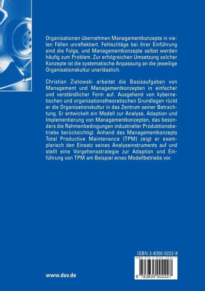 Christian Zielowski arbeitet die Basisaufgaben von Management und Managementkonzepten in einfacher und verständlicher Form auf. Ausgehend von kybernetischen und organisationstheoretischen Grundlagen rückt er die Organisationskultur in das Zentrum seiner Betrachtung. Er entwickelt ein Modell zur Analyse, Adaption und Implementierung von Managementkonzepten, das besonders die Rahmenbedingungen industrieller Produktionsbetriebe berücksichtigt. Anhand des Managementkonzepts Total Productive Maintenance (TPM) zeigt er exemplarisch den Einsatz seines Analyseinstruments auf und stellt eine Vorgehensstrategie zur Adaption und Einführung von TPM am Beispiel eines Modellbetriebs vor.