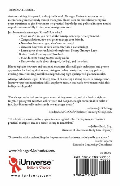 An entertaining, fast-paced, and enjoyable read, Manager Mechanics serves as both mentor and guide for newly minted managers. Blooms uses his more than twenty-five years experience to give first-timers the practical knowledge and political insights needed to perform successfully in their new management role. Just been made a manager? Great! Now what? Have kids? If so, you have all the management experience you need. Congratulations, now you get to manage your friends. Now that I'm a manager, what's my next step? Discover how work is not a democracy; it's a dictatorship! Learn about the 7 kinds of troubled employees; Sleazy, Grumpy, Lazy, Brainy, Tardy, Dummy and Troubled. How does the hiring process really work? Uncover the truth about the Good, the Bad and the Other. Bloom explains how new and seasoned managers alike will gain techniques and proven approaches for leading their teams, hiring top talent, navigating company politics, avoiding career-limiting mistakes and producing high-quality, well-planned results. Manager Mechanics is your first step toward cultivating a strong career in management. Improve your communication skills, employee morale, and work environment with this indispensable guide! "I'm always on the lookout for great new training materials, and this book is right on target. It gives great advice, is well-written and has just enough humor in it to make it fun. Eric Bloom really understands new manager needs." -Susan J. Goldberg President and CEO of Northeast Training Group, Inc. "This book is a must read for anyone in a managerial role. It's easy to read, contains practical examples, and as a result, is easy to remember." -Jeffrey Burd, Esq. Director of Placement, Kelly Law Registry "Street-wise advice on handling the important everyday issues nobody tells you about." -Frank Capecci Executive Leadership Consultant