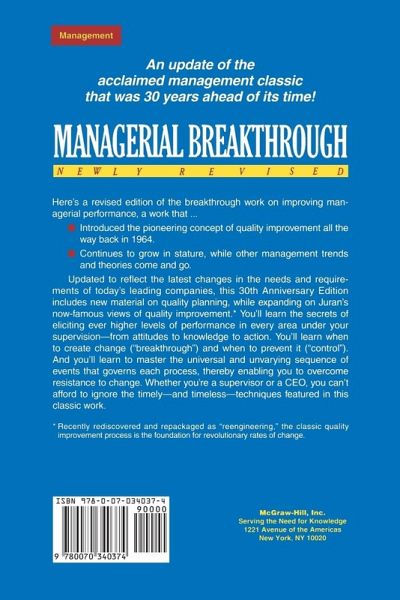 Juran contends that the manager's basic function is to create change ("breakthrough") or prevent it ("control"), and demonstrates that each process is unvaryingly governed by a universal sequence of events. You'll learn the issues that arise, virtually without fail, whenever organizations introduce change; how to master an unvarying sequence of events that will enable you to overcome resistance to change, and break through to ever higher levels of performance; how to control any action or project under your supervision; how to achieve breakthrough in every area that determines a company's success - from attitudes ... to knowledge... to action; and when it's better to initiate change and when it's better to prevent it. Regardless of your field or product - whether you are a company president, superintendent, department head, foreperson, or a supervisor - this book will prove to be of immeasurable value to you. It is a book written for everyone who must achieve results, whether through the efforts of other people or through their own efforts.