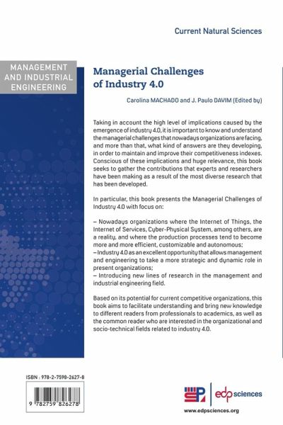 Taking in account the high level of implications caused by the emergence of industry 4.0, it is important to know and understand the managerial challenges that nowadays organizations are facing, and more than that, what kind of answers are they developing, in order to maintain and improve their competitiveness indexes. Conscious of these implications and huge relevance, this book seeks to gather the contributions that experts and researchers have been making as a result of the most diverse research that has been developed. In particular, this book presents the Managerial Challenges of Industry 4.0 with focus on: - Nowadays organizations where the Internet of Things, the Internet of Services, Cyber-Physical System, among others, are a reality, and where the production processes tend to become more and more efficient, customizable and autonomous; - Industry 4.0 as an excellent opportunity that allows management and engineering to take a more strategic and dynamic role in present organizations; - Introducing new lines of research in the management and industrial engineering field. Based on its potential for current competitive organizations, this book aims to facilitate understanding and bring new knowledge to different readers from professionals to academics, as well as the common reader who are interested in the organizational and socio-technical fields related to industry 4.0.