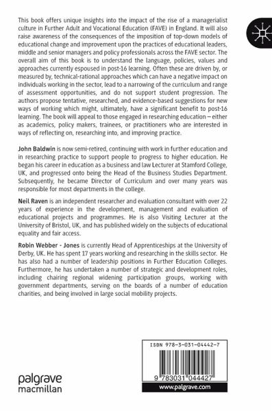 This book offers unique insights into the impact of the rise of a managerialist culture in Further Adult and Vocational Education (FAVE) in England. It will also raise awareness of the consequences of the imposition of top-down models of educational change and improvement upon the practices of educational leaders, middle and senior managers and policy professionals across the FAVE sector. The overall aim of this book is to understand the language, policies, values and approaches currently espoused in post-16 learning. Often these are driven by, or measured by, technical-rational approaches which can have a negative impact on individuals working in the sector, lead to a narrowing of the curriculum and range of assessment opportunities, and do not support student progression. The authors propose tentative, researched, and evidence-based suggestions for new ways of working which might, ultimately, have a significant benefit to post-16 learning. The book will appeal to those engaged in researching education - either as academics, policy makers, trainees, or practitioners who are interested in ways of reflecting on, researching into, and improving practice.