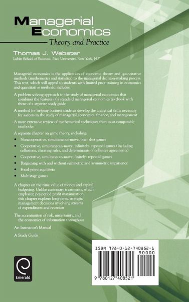 Managerial economics is the application of economic theory and quantitative methods (mathematics and statistics) to the managerial decision-making process. This book contains a chapter on game theory and on the time value of money and capital budgeting. It is intended for students with limited prior training in economics and quantitative methods.
