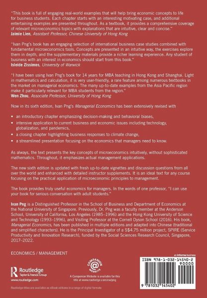 Now in its sixth edition, Ivan Png's Managerial Economics has been extensively revised with intensive application to current business and economic issues. It is an ideal text for any course focusing on the practical application of microeconomic principles to management.