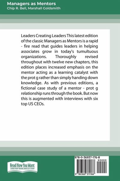 Leaders Creating Leaders This latest edition of the classic Managers as Mentors is a rapid - fire read that guides leaders in helping associates grow in today's tumultuous organizations. Thoroughly revised throughout with twelve new chapters, this edition places increased emphasis on the mentor acting as a learning catalyst with the prot g rather than simply handing down knowledge. As with previous editions, a fictional case study of a mentor - prot g relationship runs through the book. But now this is augmented with interviews with six top US CEOs. New chapters cover topics such as the role of mentoring in spurring innovation and mentoring a diverse and dispersed workforce accustomed to interacting digitally. Also new to this edition is the Mentor's Toolkit, six resources to help in developing the mentor - prot g relationship. This hands - on guide teaches leaders to be the kind of confident coaches integral to learning organizations. ''Continual learning is a key to effective leadership ... Managers as Mentors is a practical yet powerful book for helping leaders make continual learning a valuable addition to their strategy.'' Mike Krzyzewski, Head Coach, Duke University Men's Basketball, 2010 NCAA Champions. ''Mentoring is the highest of the teaching arts, and in this new edition, Chip Bell and Marshall Goldsmith have skillfully crafted the essential handbook for all those who are trusted advisors to aspiring leaders.'' Jim Kouzes, coauthor of The Leadership Challenge and Dean's Executive Fellow of Leadership, Leavey School of Business, Santa Clara University. ''Managers as Mentors will be the indispensable handbook of managers/leaders across the sectors.'' Frances Hesselbein, President and CEO, The Frances Hesselbein Leadership Institute, and former CEO, Girls Scouts of the USA.