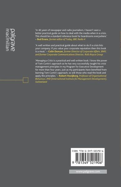 Introduction PART I: WHAT MAKES A CRISIS The Three Types of Crisis Evolution of a Crisis -The Crisis Curve Predicting a Crisis Why Managing a Crisis Matters PART II: THE ORGANISATION AND ITS UNIVERSE Organisations and their Leadership The Media in Crisis The Politicians and Regulators The Activists - Making Crisis Happen Other Stakeholders - Dealing with the Public, Customers and Suppliers PART III: DESIGN, TESTING AND IMPLEMENTATION Overview of the Process The Importance of Third Party Advocates The Crisis Management Teams Responsibilities and Logistics The Crisis Management Handbook Managing Media Relations Internal Communications Managing Politicians and the Public Training, Testing and Refinement Business Continuity Conclusion