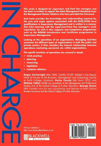This series is designed for supervisors and front line managers and has been re-written to support the latest Management Standards from the Management Charter Initiative who have provided the Foreword. Each book provides the knowledge and understanding required for the core and major options associated with the NVQ/SVQ3 level qualifications in Supervisory Management and is written in a manner that links learning with the supervisor/front line manager's work experience. As such it also supports non-competence programmes such as the NEBSM Introductory and Full Certificate programmes in Supervisory Management. Looking at the operations of an organization, Managing Activities examines the different types of organizations in both the public and private sectors. It then considers the internal relationships between operations, marketing, personnel, etc. within organizations. The specific functions of operations are covered in detail: * work practices * Planning * Resourcing * Legislation * Customer relations