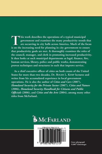 This work describes the operations of a typical municipal government and examines the many productivity trends that are occurring in city halls across America. Much of the focus is on the increasing need for planning in city government to ensure that productivity goals are met. It thoroughly examines the roles of the council, manager, and clerk in promoting increased productivity. It then looks at such municipal departments as legal, finance, fire, human services, library, police and public works, demonstrating proven techniques and structures in each that improve service. Instructors considering this book for use in a course may request an examination copy here.
