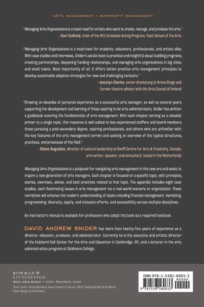 Things have changed, to say the least. The arts field is resizing, recombining, rethinking. Gone are the days of long term subscribers and reliable audiences. Arts organizations must become more flexible, adaptive, and nimble to survive and thrive in today's world. Arts managers must engage, adapt, and innovate. Great management invites creativity. Vibrant artistry welcomes strong management. Managing Arts Organizations can help. In Managing Arts Organizations, David Andrew Snider provides a playbook for navigating arts management in this new era and seeks to inspire a new generation of arts managers. Each chapter is focused on a specific topic, with principles, stories, exercises, advice, and best practices related to that topic. The appendix includes eight case studies, each illuminating issues in arts management via a real world scenario or organization. These narratives will enhance the reader's understanding of topics including financial management, marketing, programming, Diversity, Equity, and Inclusion efforts, and accessibility across multiple disciplines. An instructor's manual is available for professors who adopt the book as a required textbook.