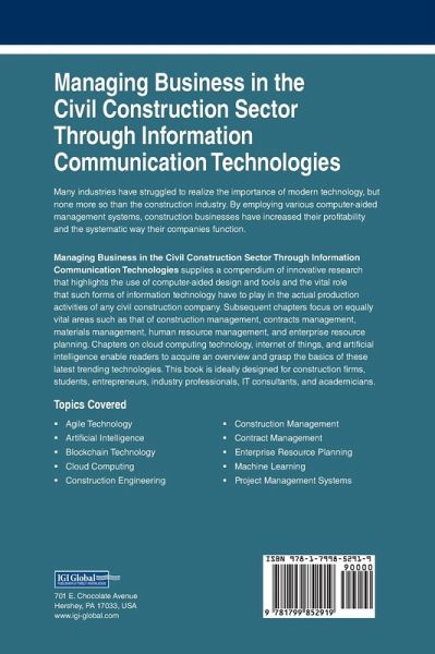 Many industries have struggled to realize the importance of modern technology, but none more so than the construction industry. By employing various computer-aided management systems, construction businesses have increased their profitability and the systematic way their companies function. Managing Business in the Civil Construction Sector Through Information Communication Technologies supplies a compendium of innovative research that highlights the use of computer-aided design and tools and the vital role that such forms of information technology have to play in the actual production activities of any civil construction company. Subsequent chapters focus on equally vital areas such as that of construction management, contracts management, materials management, human resource management, and enterprise resource planning. Chapters on cloud computing technology, internet of things, and artificial intelligence enable readers to acquire an overview and grasp the basics of these latest trending technologies. This book is ideally designed for construction firms, students, entrepreneurs, industry professionals, IT consultants, and academicians.