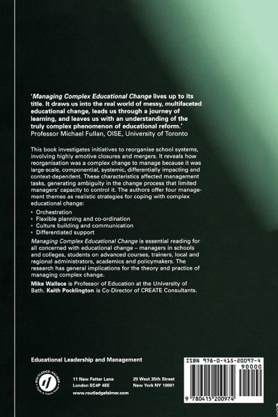 Why is educational change becoming more complex? Are there patterns in this complexity? How may managers cope effectively with complex educational change? This book investigates initiatives to reorganise school systems, involving highly emotive closures and mergers. It reveals how reorganisation was a complex change to manage because it was large-scale, componential, systematic, differentially impacting and context dependent. These characteristics affected management tasks, generating ambiguity in the change process that limited managers' capacity to control it. The authors offer four management themes as realistic strategies for coping with complex educational change: *orchestration *flexible planning and coordination *culture building and communication *differentiated support Managing Complex Educational Change is essential reading for all concerned with educational change - managers in schools and colleges, students on advanced courses, trainers, local and regional administrators, academics and policy makers. The research has general implications for the theory and practice of managing complex change.