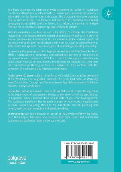 Part 1:-Background and Theoretical Context.- Chapter 1:- Introduction.- Chapter 2:- Understanding Small Island States & Territories by Acolla Lewis-Cameron & Leslie-Ann Jordan-Miller .- Chapter 3:- Conceptualising Resilience in Small Island States by Sherma Roberts .- Part 2:-Environmental Resilience.- Chapter 4:- Cruise Tourism and Resilience in Marine Ecosystems in the Caribbean: A Socio-Environmental Study of St. Lucia by Myrna Ellis.- Chapter 5:- Tourism Resilience in the Caribbean island of Cozumel: Best practice and high risk áreas by Kennedy Obombo Magio.- Chapter 6:- A resilient eco-tourism island: A case study of Dominica and its tourism recovery strategies post 2017 Hurricane Maria by Tenisha Brown-Williams and Amanda Charles.- Part 3:- Socio-Cultural Resilience.- Chapter 7:- Community resilience in the face of a natural disaster: Puerto Rico's adventure tourism industry by Mechelle Best and José H. Gonzalez.- Chapter 8:-An Integrated Path Towards a Resilient Tourism Sector in North-East Tobago by Aljoscha Wothke, Joanna Moses-Wothke and Leslie-Ann Jordan.- Chapter 9:-From exclusive to exclusion zone and back again: Marketing Montserrat under the Mount Chance eruptions by Johnathan Skinner.- Chapter 10:-Building a resilient tourism future through youth involvement and consumer-centric service excellence in Grenada by Marion Joppe & Kimberly Thomas-Francois.- Part 3:-Economic Resilience.- Chpater 11:-Increasing the Resilience of Micro, Small and Medium Tourism Enterprises to Tropical Cyclones in Small Island Developing States by Thalia Balkaran and David Smith.- Chapter 12:-Building Resilience by Strengthening the Link between Tourism and Agriculture: An Assessment of the Purchasing Patterns of Selected Hotels in Jamaica by Eritha Huntley-Lewis, Tolulope Bewaji and Clive Scott.- Chapter:- An analysis of economic and political resilience strategies adopted by The Bahamas as an archipelagic Small Island Development State by Sophia Rolle.- Chapter 14:-Integrative Entrepreneurship as a Tourism Resilience Strategy for Sustainable Development: A Case Study of Castara, Tobago by Shinelle Smith and Leslie-Ann Jordan-Miller.- Chapter 15:- Hotel Resilience to Terrorist Threats - Is there a case for Barbados? by Vincent Bradshaw.- Chapter 16:- The tension between lives and livelihoods- an analysis of resilience strategies by tourism-dependent Caribbean territories by Sherma Roberts.- Conclusion.