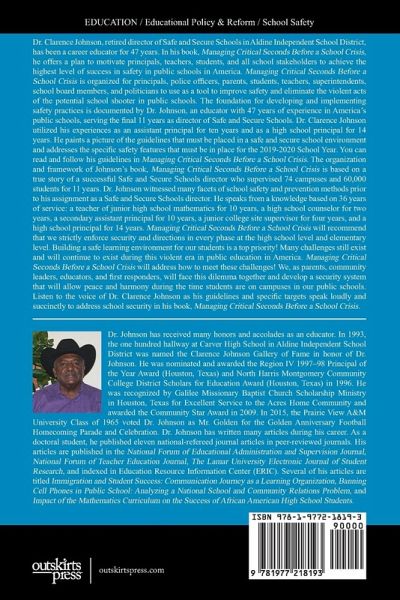 My book, Managing Critical Seconds Before a School Crisis is intended to motivate principals, teachers, students, and all school stakeholders to achieve the highest level of success in safety in public schools in America. It is organized for principals, policer officers, parents, students, teachers, superintendents, school board members, and politicians to use as a tool to improve safety and eliminate the violent acts of the school shooter in public schools. The organization and framework of this book is based on a true story of a safe and secure schools director who supervised 74 campuses and 60,000 students for 11 years. I saw many facets of school safety and prevention methods prior to my assignment as safe and secure schools director. I speak from a knowledge base of 47 years of service in public schools. This book, Managing Critical Seconds Before a School Crisis will recommend that we strictly enforce security and directions in every phase at the high school level and elementary level. Building a safe learning environment for our students is a top priority! Many challenges still exist and will continue to exist during this violent era in public education in America. We as parents, community leaders, educators, and first responders will face this dilemma together and develop a security system that will allow peace and harmony during time students are on campuses in our public schools. The purpose of this book is to share my views on keys to building an effective campus security system. As director of safe and secure schools for a large urban public school district for 11 years, I had the opportunity to research school security standards, attend safety staff development, seminars, observe "best practices" in surrounding school districts, develop, and implement a school district crisis management plan. We know as educators to put in place the best safety plan for our students and teachers. My book will summarize key components of building an effective campus security system. Managing Critical Seconds Before a School Crisis is designed to raise the hope and dreams of all high school and elementary school students who need to believe that accepting a challenge to be the best is only possible when hard work is applied correctly and in a timely manner. This book will recommend that we strictly enforce security and directions in every phase of school safety. The average elementary and junior high reader will have the opportunity to read this book and understand the path of a safe and secure learning environment.