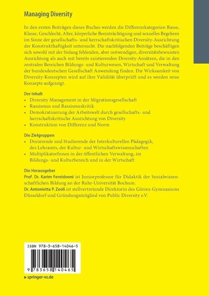 In den ersten Beiträgen dieses Buches werden die Differenzkategorien Rasse, Klasse, Geschlecht, Alter, körperliche Beeinträchtigung und sexuelles Begehren im Sinne der gesellschafts- und herrschaftskritischen Diversity-Ausrichtung der Konstrukthaftigkeit untersucht. Die nachfolgenden Beiträge beschäftigen sich sowohl mit der bislang fehlenden, aber notwendigen, diversitätsbewussten Ausrichtung als auch mit bereits existierenden Diversity-Ansätzen, die in den zentralen Bereichen Bildungs- und Kulturwesen, Wirtschaft und Verwaltung der bundesdeutschen Gesellschaft Anwendung finden. Die Wirksamkeit von Diversity-Konzepten wird auf ihre Validität überprüft und es werden neue Konzepte aufgezeigt.