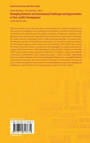 This book draws lessons from the story of Sri Lanka's post-conflict development in the context of a struggle for socio-political reconciliation, a turbulent world economy, and difficult internal and external political challenges. Heightened volatility in the global economy and intensifying geopolitical rivalries pose complex policy challenges for small countries embarking on post-conflict daunting challenges. To sustain peace, development needed to be broad based and inclusive. It needed to rapidly reconstruct war-devastated regions, restore macroeconomic stability, while delivering a 'peace dividend'. The book contains contributions that highlight Sri Lanka's endeavours of coping with adverse shocks, while exploiting new opportunities. It showcases how the island country had to attract capital and assistance, and support of the international community, including that of the rising Asian giants - China and India. Addressing the post-conflict challenges of sourcing development finance in a new global financial and political landscape, the book would be of interest to researchers working on post-conflict development in the context of a volatile global economy and changing aid architecture, and would also act as an important resource for policy makers.