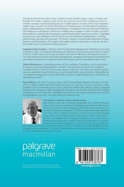 Magdalene Rosenmöller is Professor of IESE's Operations Management Department, University of Navarra, Spain. German by nationality, she holds a MD (University Louis Pasteur, France), a PhD in Health Policy (University of London, UK) and an MBA from IESE Business School. Her main areas of expertise are health management, managing information technology and innovation in health care, European health and research policies, and global health issues. Diane Whitehouse is a founding partner of The Castlegate Consultancy, which specialises in research, policy and deployment in eHealth. She previously worked in the European Commission's DG Connect in these same areas of expertise. Her career has spanned action research, academic research/teaching, civic and human rights, policy formation, and publishing. Her academic background covered information systems, organizational theory and behaviour, and political science. Petra Wilson is the Chief Executive Officer of the International Diabetes Federation. She has a PhD in Public Health Law from Oxford University, UK, and over 20 years' experience in the eHealth sector as senior director in Cisco's Connected Health team, and previously as European Director of the European Health Management Association. She has also worked for the European Commission in its eHealth Directorate. Originally trained in law, Petra spent several years as a lecturer at Nottingham University, UK, specialising in healthcare law.