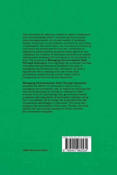 This book analyzes the ability of insurance to play a role in managing environmental risk. It begins by outlining the role insurance plays in society in contrast to other societal tools for addressing risk: government benefit programs and imposition of involuntary liability using the court system. By so doing, the book describes the comparative advantages of insurance. The book then analyzes the insurability of the risks. Finally, the book applies the insurability analysis to three concrete environmental examples.