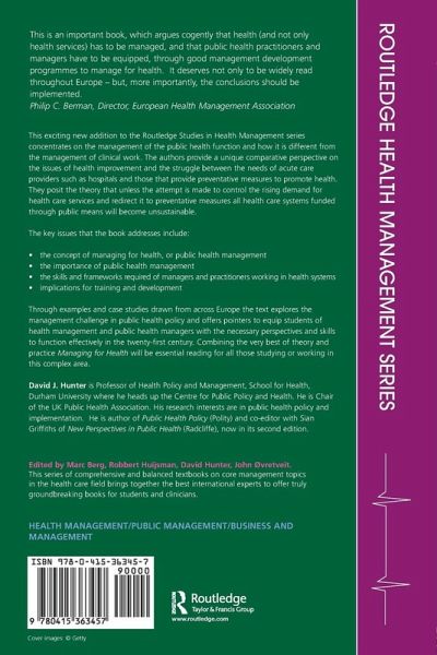 Expertly mixing theory with practice, this text makes a unique and important contribution to the area of health management. Through examples and case studies drawn from across Europe, Managing for Health explores the management challenge in public health policy and offers pointers to equip students of health management and public health managers with the necessary perspectives and skills to function effectively in the twenty-first century. This book takes a comparative perspective on the issues of health improvement and the struggle between the needs of acute care providers, such as hospitals and those that provide preventative measures to promote health. The key issues addressed by this book include: the concept of managing for health, or public health management the importance of public health management the skills and frameworks required of managers and practitioners working in health systems the implications for training and development. This comprehensive and balanced textbook is an essential read for students and those engaged with health management, public health and public management .