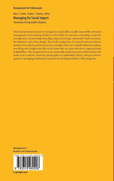 Part I INTRODUCTION.- Managing for Return on Social Innovation (ROSI): Pillars for Sustainable Social Impact.- Part II SOCIAL JUSTICE AND SUSTAINABLE ENTERPRISE.- A Marketplace Approach to Building and Supporting Sustainable Social Purpose Organizations.- Social Enterprise for Economic Opportunity at UTEC.- Food With Purpose: Haley House Bakery Café and Dudley Dough.- PART III RETHINKING CORPORATE SOCIAL RESPONSIBILITY FROM THE OUTSIDE IN.- Evolution, Innovation, and Best Practices in Corporate Social Impact.- Transformation through Social Impact at Whirlpool.- Embedding Environmental Advocates: EDF Climate Corps.- Stakeholder Voices Shaping Community Engagement at b.good.- PART IV PUBLIC-PRIVATE PARTNERSHIPS TO MAKE CITIES MORE LIVABLE FOR ALL.- Co-Creating More Livable Cities.- Transforming the Urban Built Environment: The Seattle 2030 District as a Model for Collaborative Change.- A Community-Driven Change Model in Battle Creek: Project 20/20.- PART V INVESTING FOR SCALABLESOCIAL CHANGE.- Catalyzing Social Impact Investments.- Impact Investing at the Base of the Pyramid: Unitus Seed Fund.- PART VI MEASURING AND REPORTING ON SOCIAL IMPACT.- Measuring Success in the Development of Smart and Sustainable Cities.- Measuring Your Company's Impact: How to Make the Most of Sustainability Reporting Frameworks.