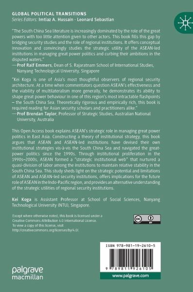 This Open Access book explains ASEAN's strategic role in managing great power politics in East Asia. Constructing a theory of institutional strategy, this book argues that the regional security institutions in Southeast Asia, ASEAN and ASEAN-led institutions have devised their own institutional strategies vis-à-vis the South China Sea and navigated the great-power politics since the 1990s. ASEAN proliferated new security institutions in the 1990s and 2000s that assumed a different functionality, a different geopolitical scope, and thus a different institutional strategy. In so doing, ASEAN formed a "strategic institutional web" that nurtured a quasi-division of labor among the institutions to maintain relative stability in the South China Sea. Unlike the conventional analysis on ASEAN, this study disaggregates "ASEAN" as a collective regional actor into specific individual institutions-ASEAN Foreign Ministers' Meeting, ASEAN Summit, ASEAN-China dialogues, ASEAN Regional Forum, East Asia Summit, and ASEAN Defense Ministers Meeting and ASEAN Defense Ministers Meeting-Plus-and explains how each of these institutions has devised and/or shifted its institutional strategy to curb great powers' ambition in dominating the South China Sea while navigating great power competition. The book sheds light on the strategic potential and limitations of ASEAN and ASEAN-led security institutions, offers implications for the future role of ASEAN in the Indo-Pacific region, and provides an alternative understanding of the strategic utilities of regional security institutions.