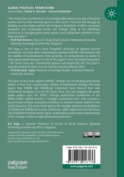 This Open Access book explains ASEAN's strategic role in managing great power politics in East Asia. Constructing a theory of institutional strategy, this book argues that the regional security institutions in Southeast Asia, ASEAN and ASEAN-led institutions have devised their own institutional strategies vis-à-vis the South China Sea and navigated the great-power politics since the 1990s. ASEAN proliferated new security institutions in the 1990s and 2000s that assumed a different functionality, a different geopolitical scope, and thus a different institutional strategy. In so doing, ASEAN formed a "strategic institutional web" that nurtured a quasi-division of labor among the institutions to maintain relative stability in the South China Sea. Unlike the conventional analysis on ASEAN, this study disaggregates "ASEAN" as a collective regional actor into specific individual institutions-ASEAN Foreign Ministers' Meeting, ASEAN Summit, ASEAN-China dialogues, ASEAN Regional Forum, East Asia Summit, and ASEAN Defense Ministers Meeting and ASEAN Defense Ministers Meeting-Plus-and explains how each of these institutions has devised and/or shifted its institutional strategy to curb great powers' ambition in dominating the South China Sea while navigating great power competition. The book sheds light on the strategic potential and limitations of ASEAN and ASEAN-led security institutions, offers implications for the future role of ASEAN in the Indo-Pacific region, and provides an alternative understanding of the strategic utilities of regional security institutions.