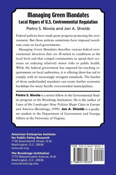 "A Brookings Institution Press and American Enterprise Institute publication Federal policies have made great progress protecting the environment. But the policies sometimes have imposed inordinate costs on local governments. Managing Green Mandates describes how various federal environmental directives do not suit diverse conditions at the local level, and compel local communities to spend their revenues on reducing relatively minor risks to the public health. While policymakers have thrown far-reaching requirements at the feet of local authorities, the federal government is providing them less aid to comply with the increasingly stringent standards. The burden of these underfunded mandates can further disadvantage many overtaxed municipalities. Pietro Nivola is a senior fellow in the Governmental Studies program at the Brookings Institution. He is the author of The Laws of the Landscape: How Politics Shape Cities in Europe and America (Brookings 1999). Jon Shields is a graduate student in the Department of Government and Foreign Affairs at the University of Virginia. "